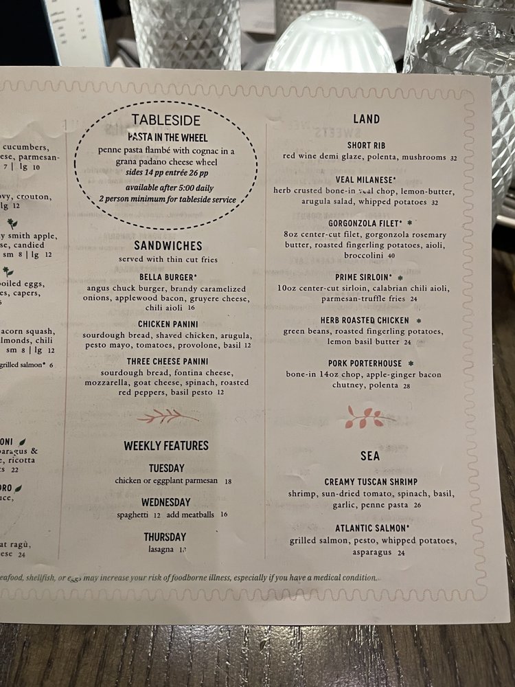 minimum of one large or two small fettucine pasta flambé in a grana padano cheese wheel • small $. | large $. • mon-thurs PM and fri-sun PM